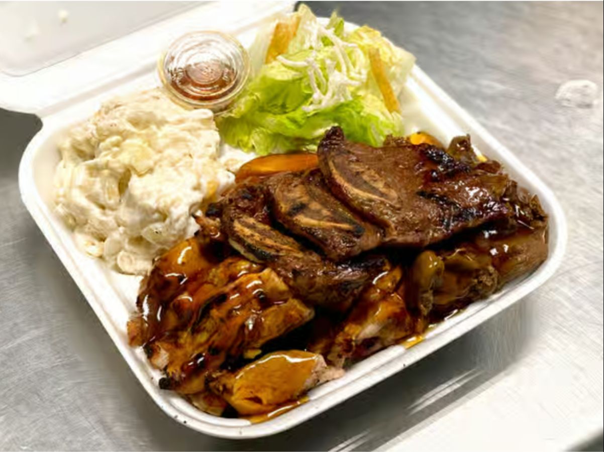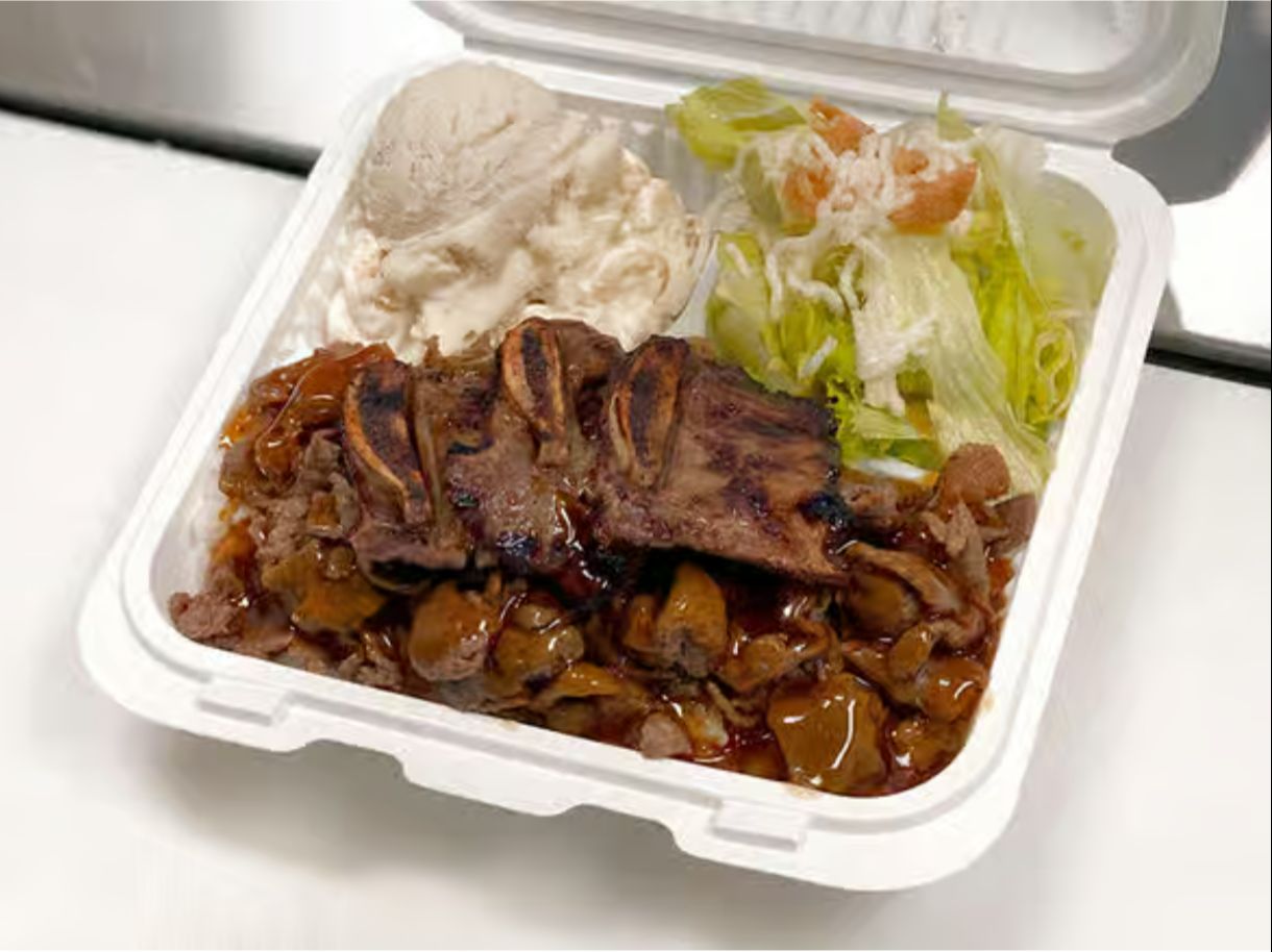 Beef and kalbi plate includes our tender bulgogi beef and kalbi, white rice, macaroni salad, potato salad, and side salad topped with crispy rice noodles dressed with our house made Asian vinaigrette dressing. Meats are smothered in teriyaki sauce.