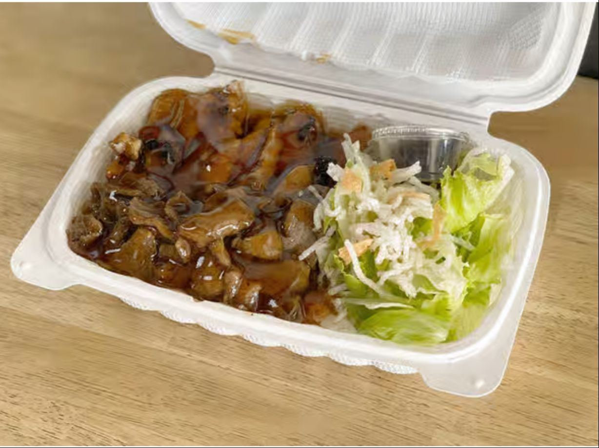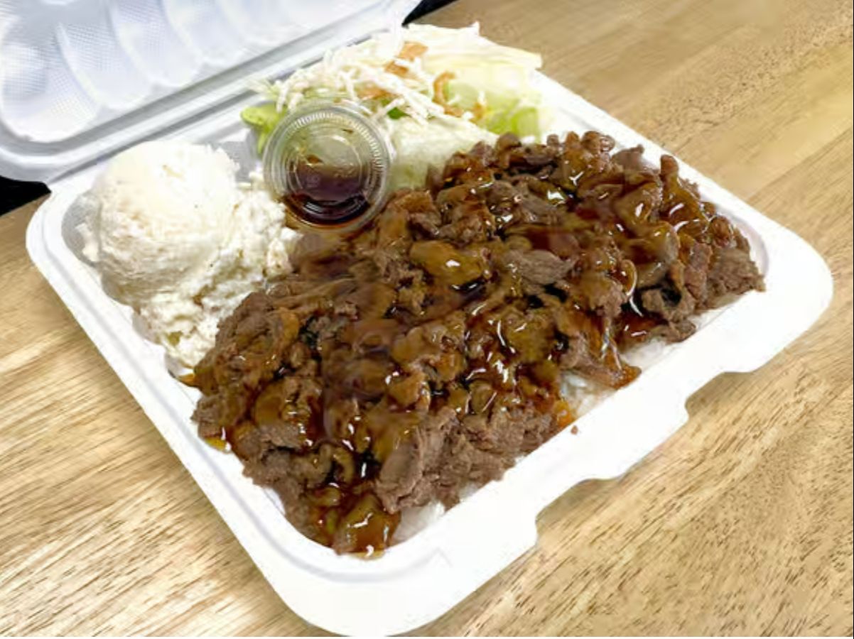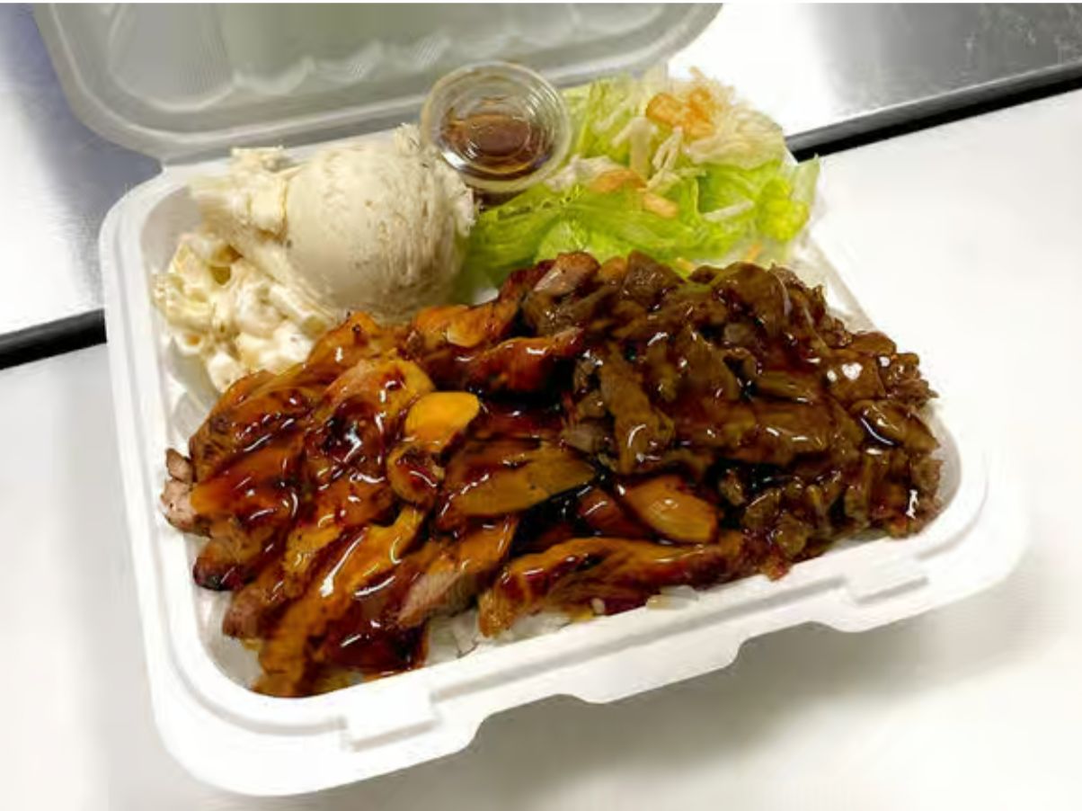 Chicken and beef plate includes our grilled chicken and bulgogi beef, white rice, macaroni salad, potato salad, and side salad topped with crispy rice noodles dressed with our house made Asian vinaigrette dressing. Chicken and beef is smothered in teriyaki sauce.