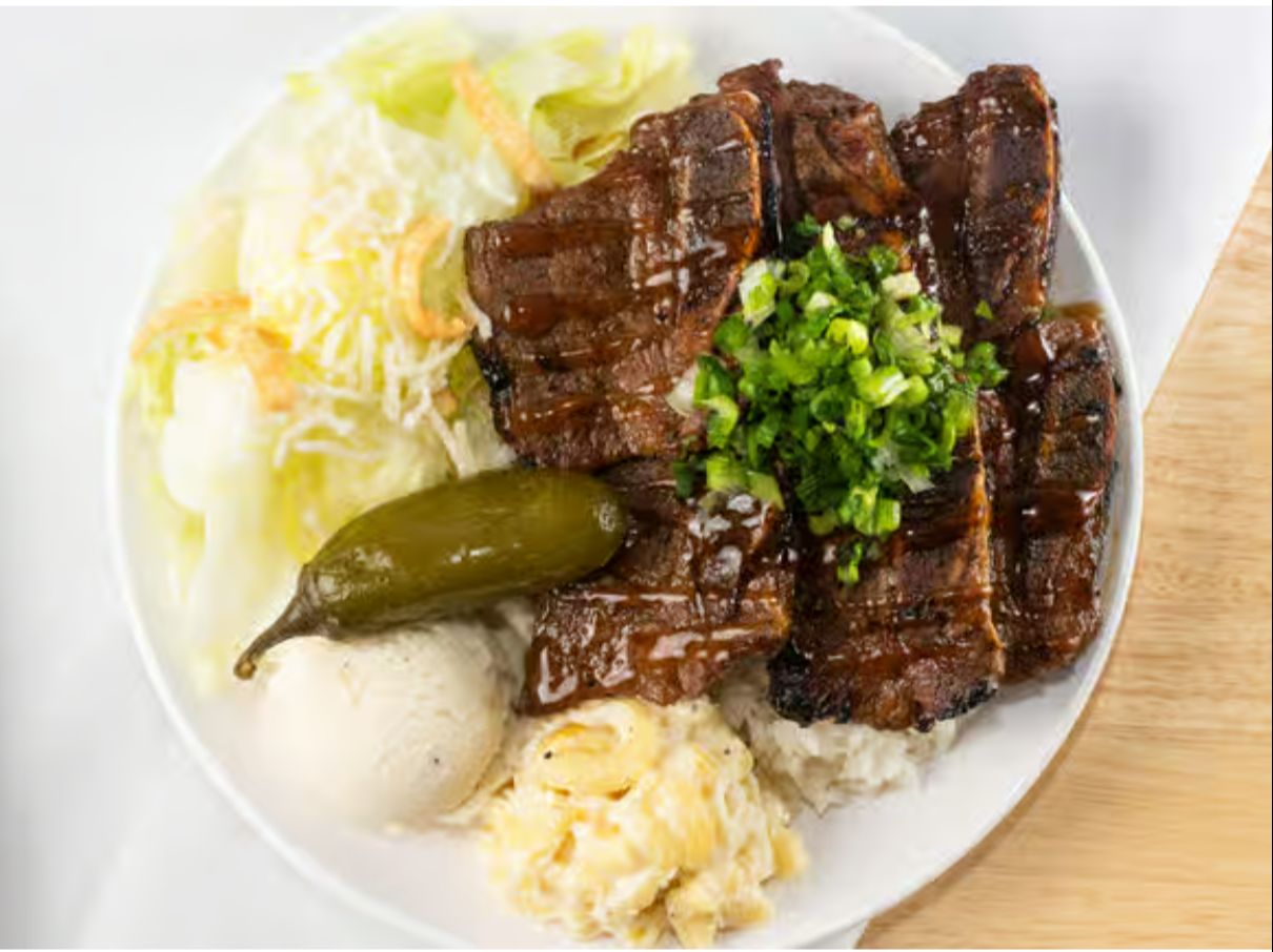 Kalbi plate includes two strips of our tender bone in short rib marinated to perfection, white rice, macaroni salad, potato salad, and side salad topped with crispy rice noodles dressed with our house made Asian vinaigrette dressing.