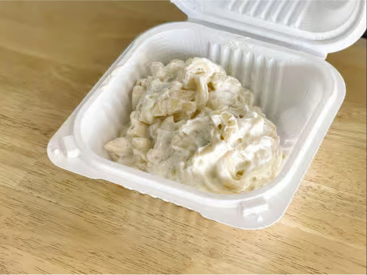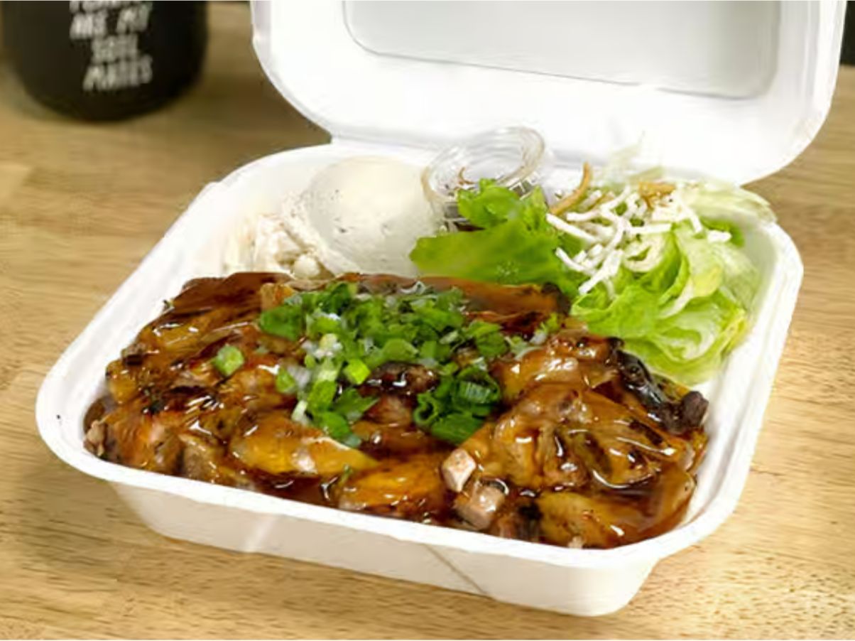 Chicken plate includes our juicy grilled chicken, white rice, macaroni salad, potato salad, and side salad topped with crispy rice noodles dressed with our house made Asian vinaigrette dressing. Chicken is smothered in teriyaki sauce.