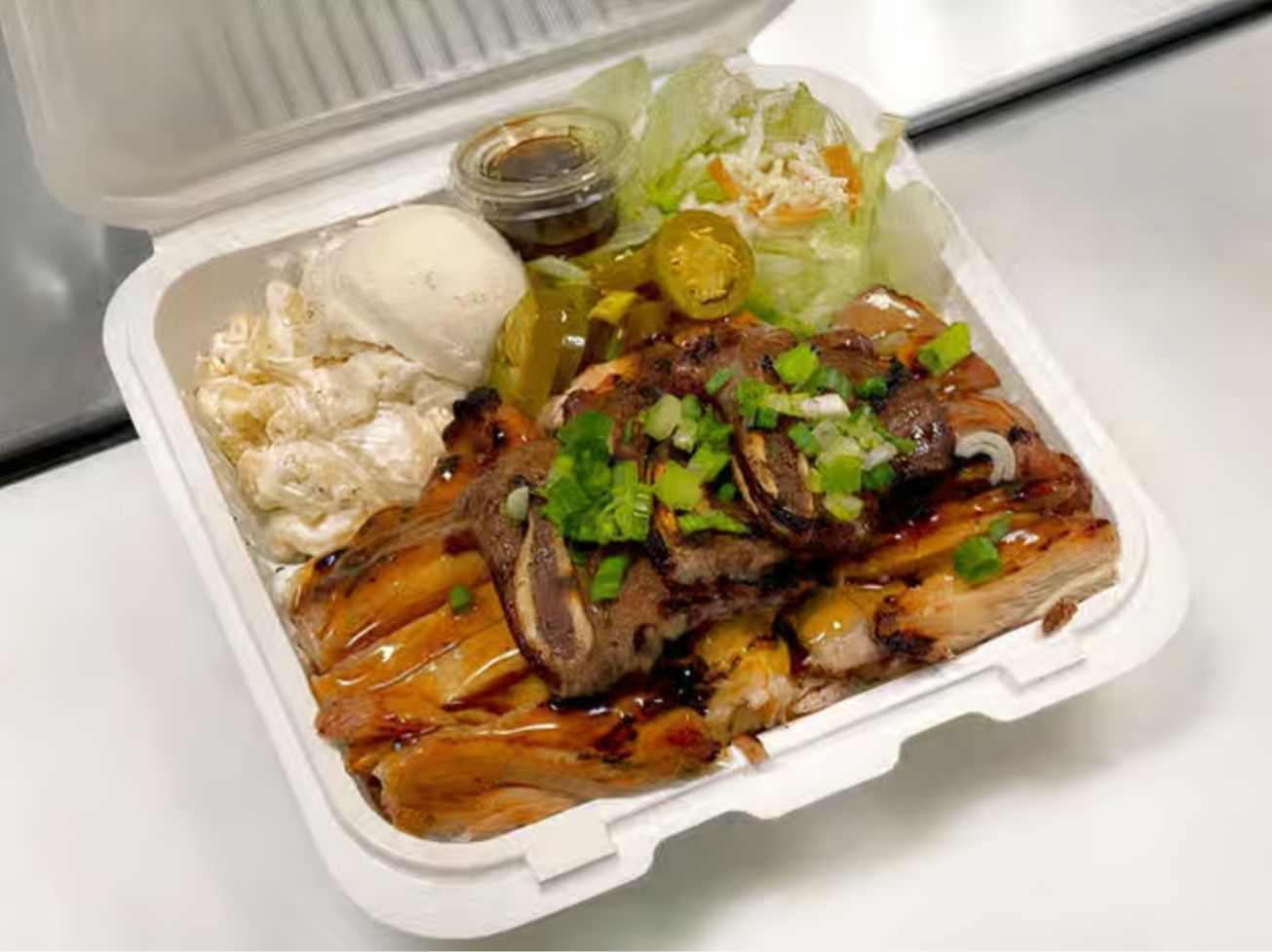 Chicken and kalbi plate includes our grilled chicken, and kalbi, white rice, macaroni salad, potato salad, and side salad topped with crispy rice noodles dressed with our house made Asian vinaigrette dressing. Meats are smothered in teriyaki sauce.