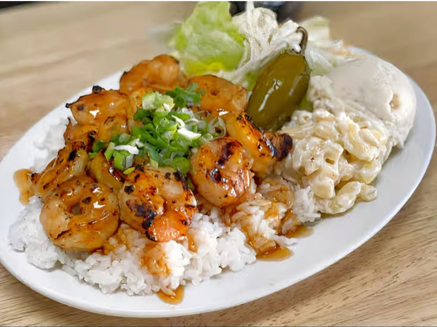 Shrimp plate includes our succulent grilled shrimp drizzled with our house made teriyaki sauce, white rice, macaroni salad, potato salad, and side salad topped with crispy rice noodles dressed with our house made asian vinaigrette dressing.
