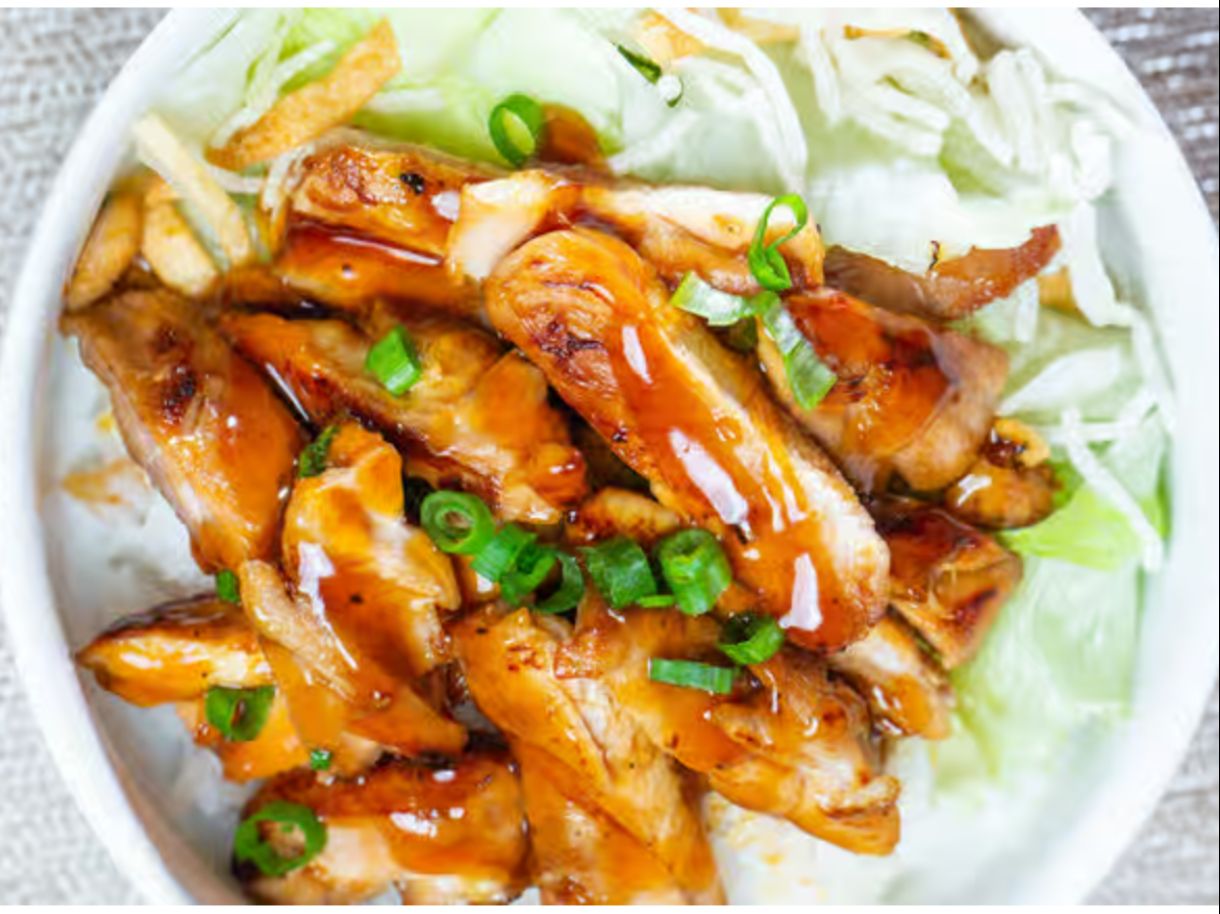 Chicken bowl includes white rice and salad topped with crispy rice noodles dressed in our homemade Asian vinaigrette dressing. Chicken smothered in teriyaki sauce.